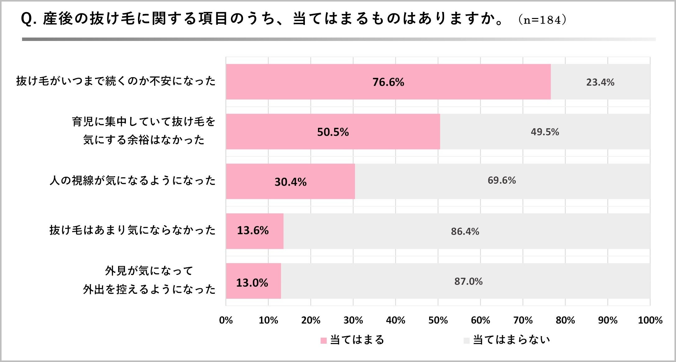続いて、産後の抜け毛が続いている間、不安に感じたことなどについて尋ねたところ、「抜け毛がいつまで続くのか不安になった」(76.6%)と答えた方は7割以上にも及びました。前問で、半年以上抜け毛が続いたと答えた方が多かったことからも、抜け毛が治まらないことを不安に感じる方も多いことが分かります。
