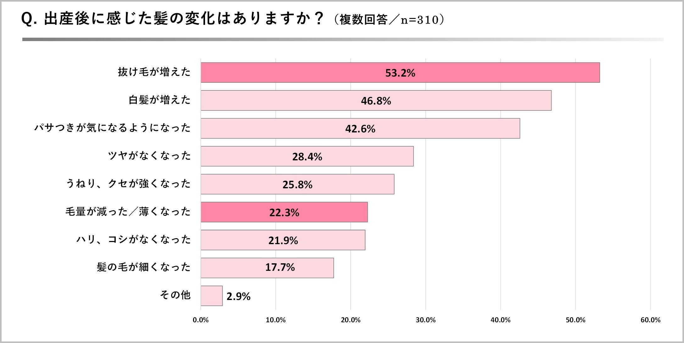 まず、出産後に感じた髪の変化について尋ねたところ、約半数の方が「抜け毛が増えた」(53.2%)と回答しました。また、「毛量が減った/薄くなった」と答えた方も22.3%に上り、多くの方が産後の抜け毛を経験していることが分かります。