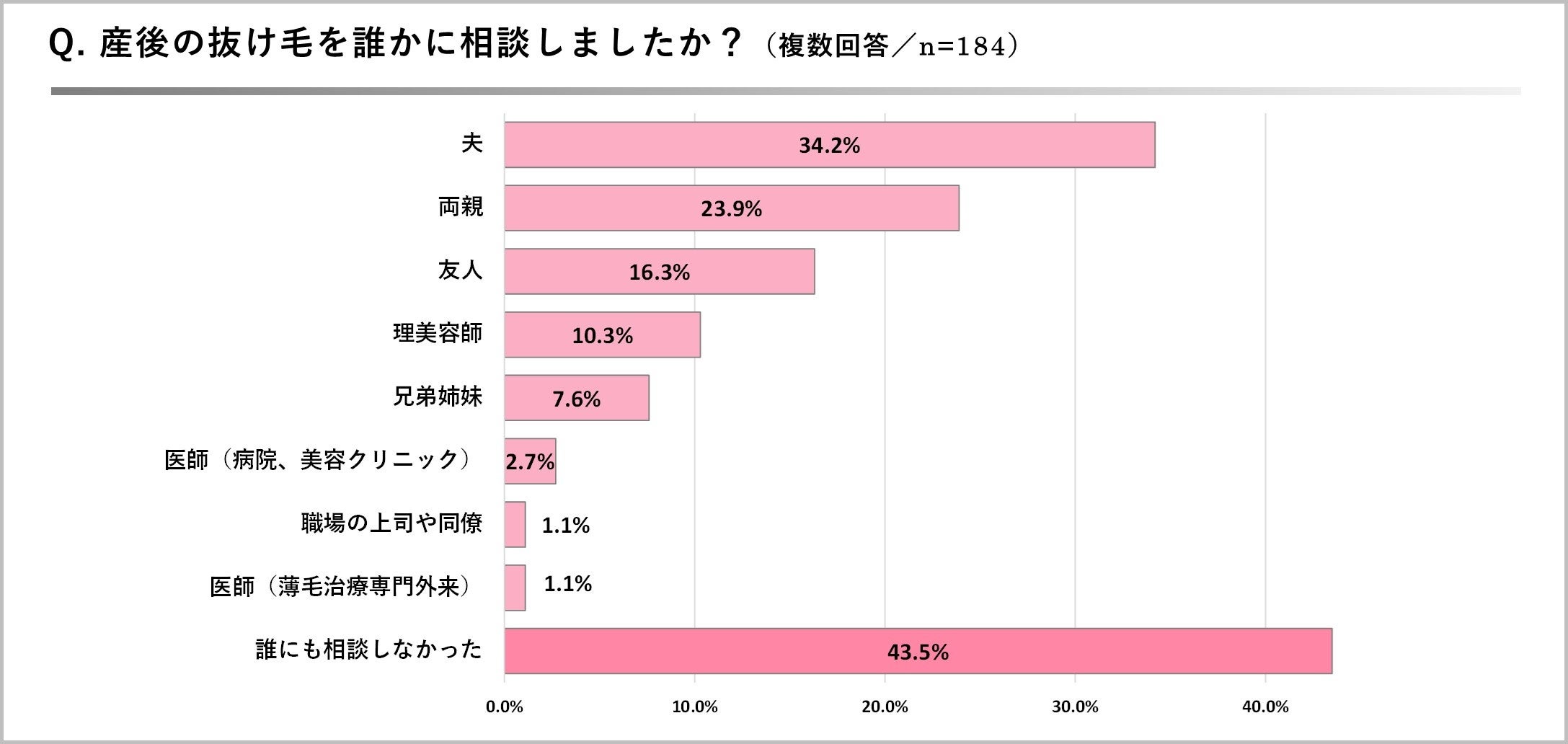 最後に、産後抜け毛の悩みを誰かに相談したか尋ねたところ、「夫」が34.2%でトップとなり、次いで「両親」(23.9%)が続き、家族に相談をしていた方が多いことが分かります。