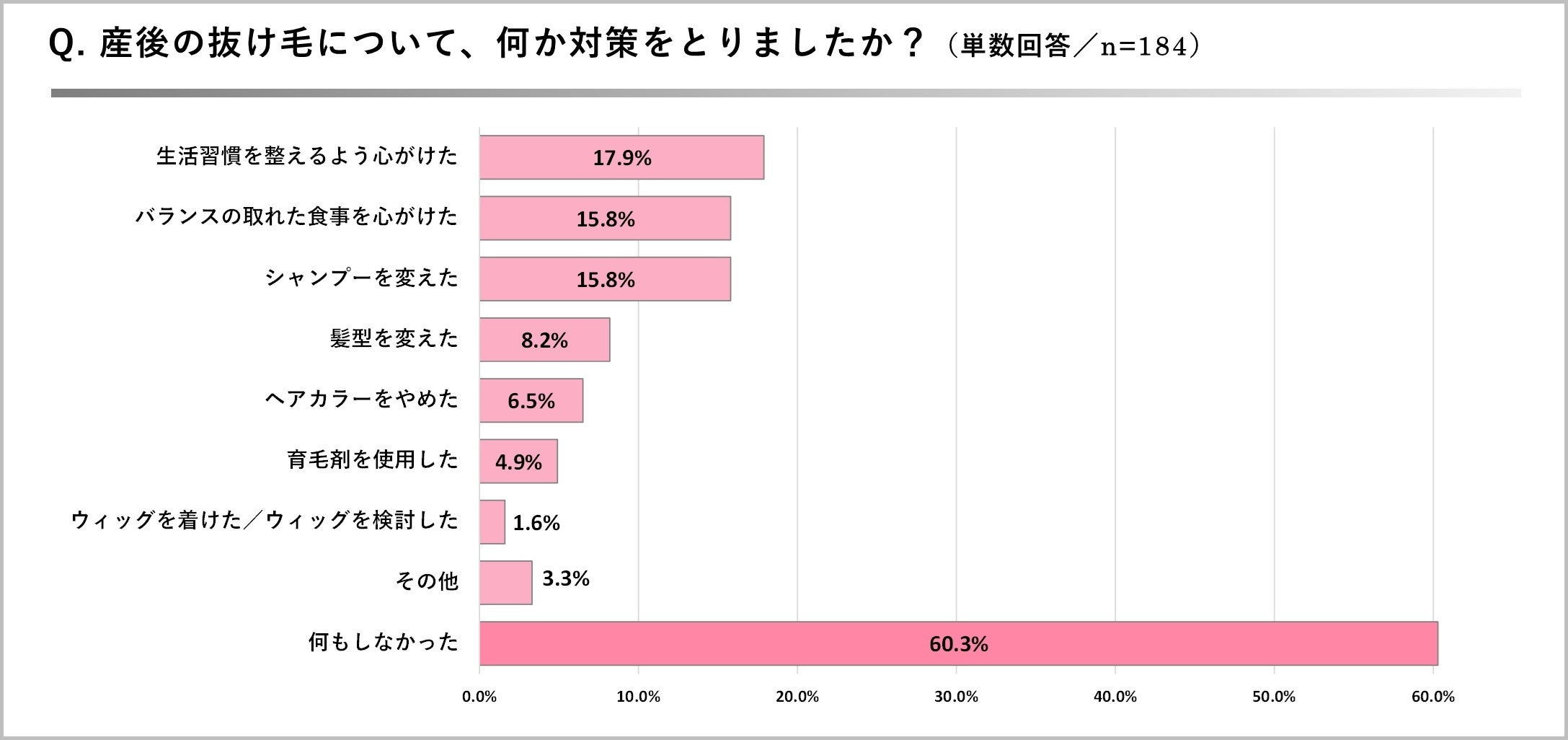 次に、産後の抜け毛に対して何らかの対策をとったか尋ねたところ、「何もしなかった」(60.3%)と答えた方が約6割にも上る結果となりました。前問で「育児に集中していて抜け毛を気にする余裕はなかった」と答えた方が約半数いたことからも、育児優先で、自身のケアを後回しにしている傾向が見られました。