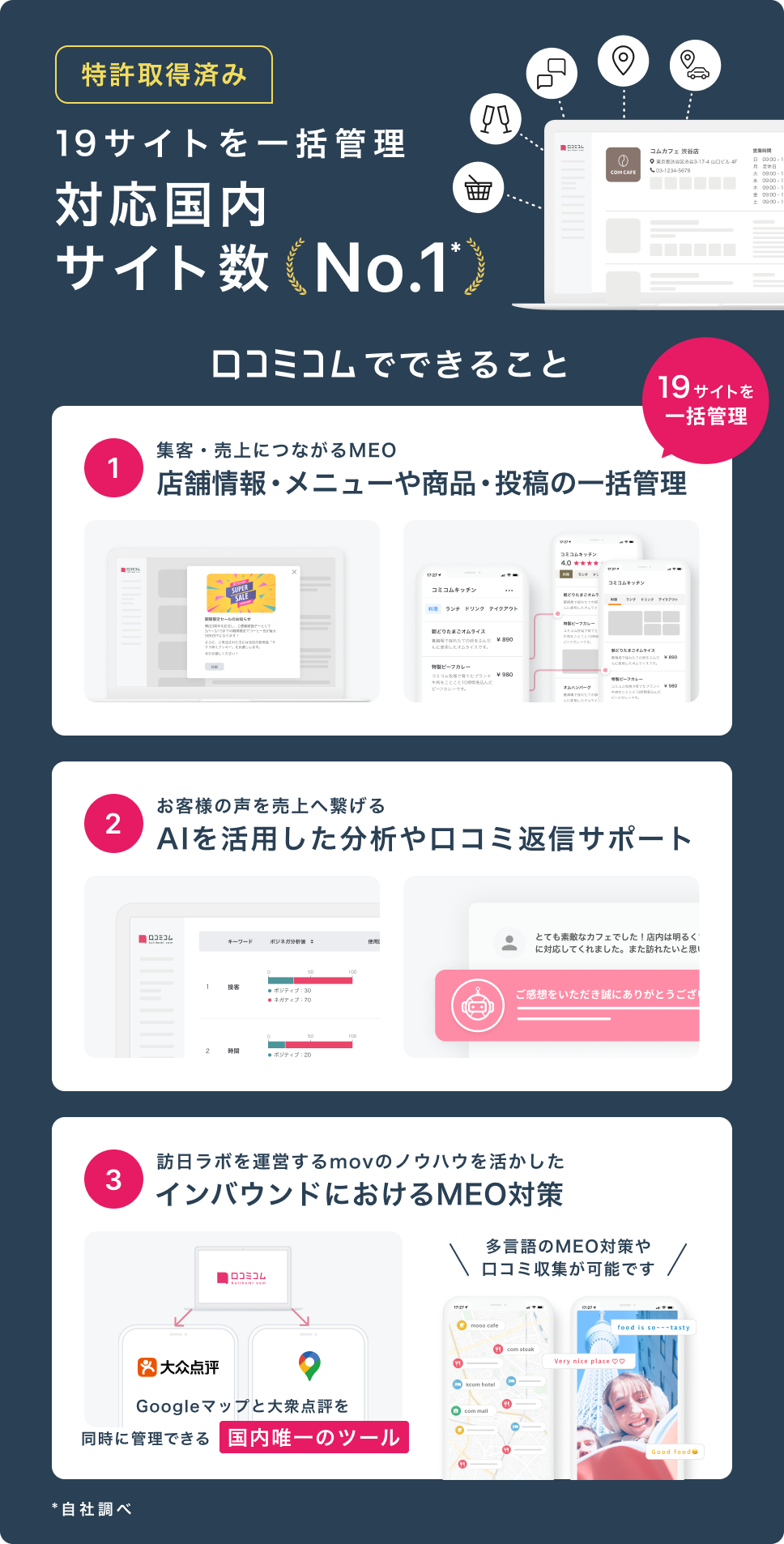 口コミコムは、国内外の口コミサイトを”もっと”売上に変える「口コミサイトの一括管理ツール」です。