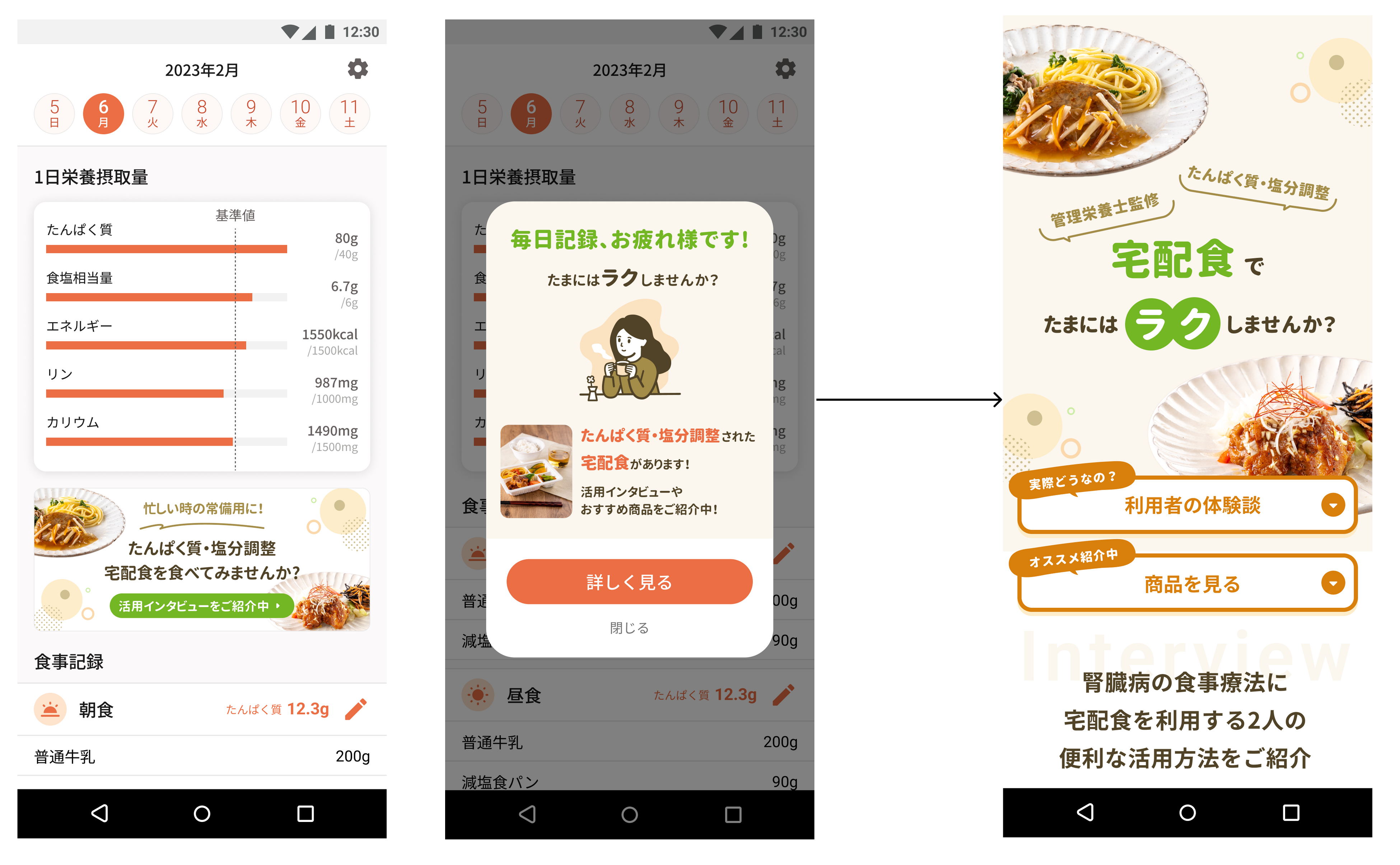 腎臓病の方向け栄養計算アプリ「栄養ビジョン」および血液検査記録アプリ「じんぞうグラフ」の両アプリ内から直接宅配食の購入ページに遷移することができ、そこから弊社の「たんぱく&塩分調整気配り宅配食」を購入することができます。