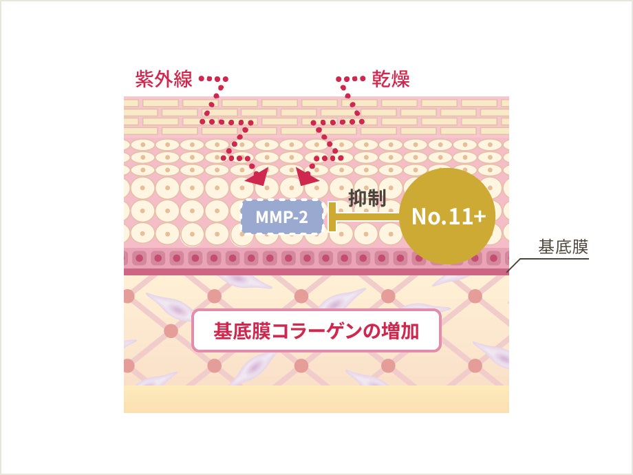 基底膜は紫外線などにより発生するタンパク質分解酵素MMP-2などによって分解されてしまいますが、ライスパワーNo.11+は、基底膜コラーゲンを分解する酵素の活性を抑制して、基底膜を構成する主成分の1つであるコラーゲンの量を増やし、シワ改善に寄与します。