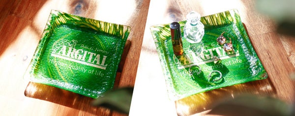 グリーンクレイの主成分であるシリカが含まれたガラスに、緑色のペイントを大胆に塗ったアルジタル社のオリジナルプレート。