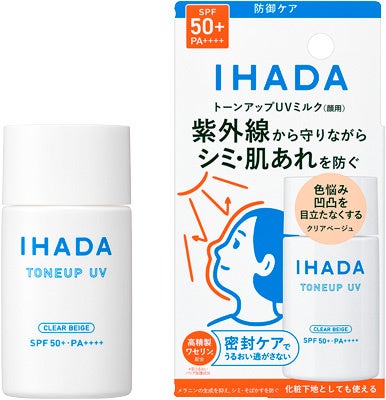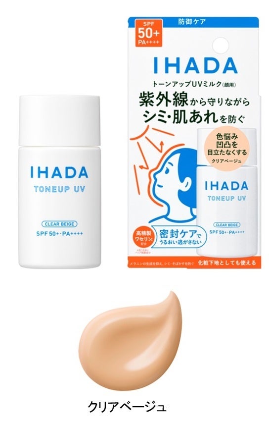 「イハダ 薬用フェイスプロテクトUV ミルク」は、紫外線から肌を守ることに加え、ブルーライトや花粉、PM2.5など、6つの肌あれ要因から守るとともに、美白&抗肌あれ有効成分配合により、メラニン生成を抑えてシミ・そばかすを防ぐだけではなく、肌あれ予防効果もあります。また、トラブルリスク肌※4の方が気にしがちな色ムラ、くすみ、赤み、毛穴などを目立たなくするクリアベージュのトーンアップ効果でツヤ肌に導きます。