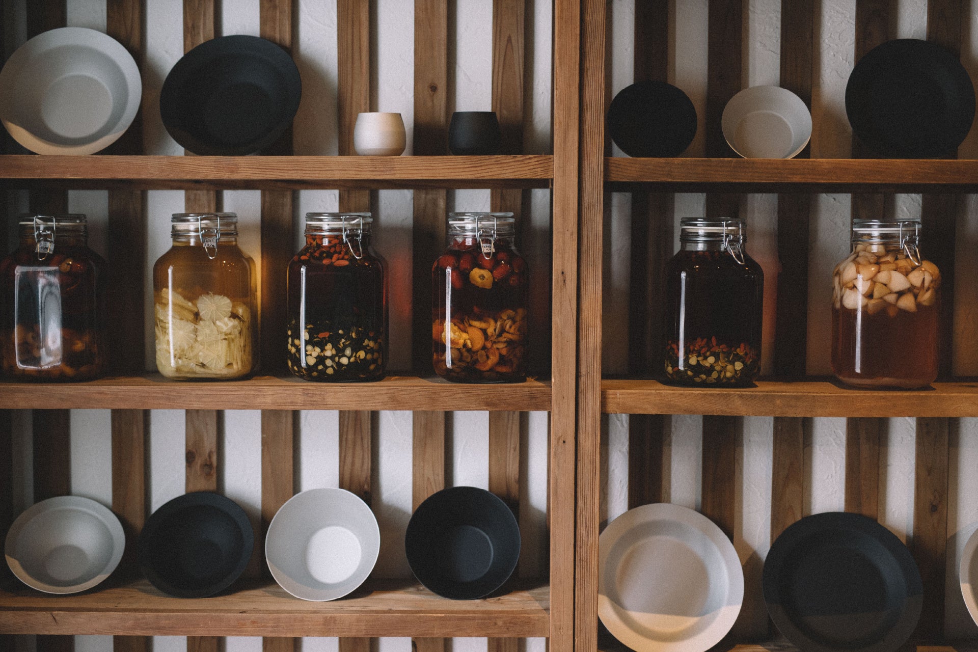 付け合わせ4種類(干し芋、白菜と金針菜のゆず甘酢漬け、ハチノスと薬膳キノコの醤油煮、イタヤ貝のニラ醤和え)とともに、玄米、雑穀米、もち麦よりいずれかを選択