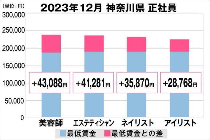 2023年12月時点で『美プロ』に掲載されている「神奈川県」の「美容師・エステティシャン・ネイリスト・アイリスト」求人における「正社員」「アルバイト・パート」の給料を抽出。