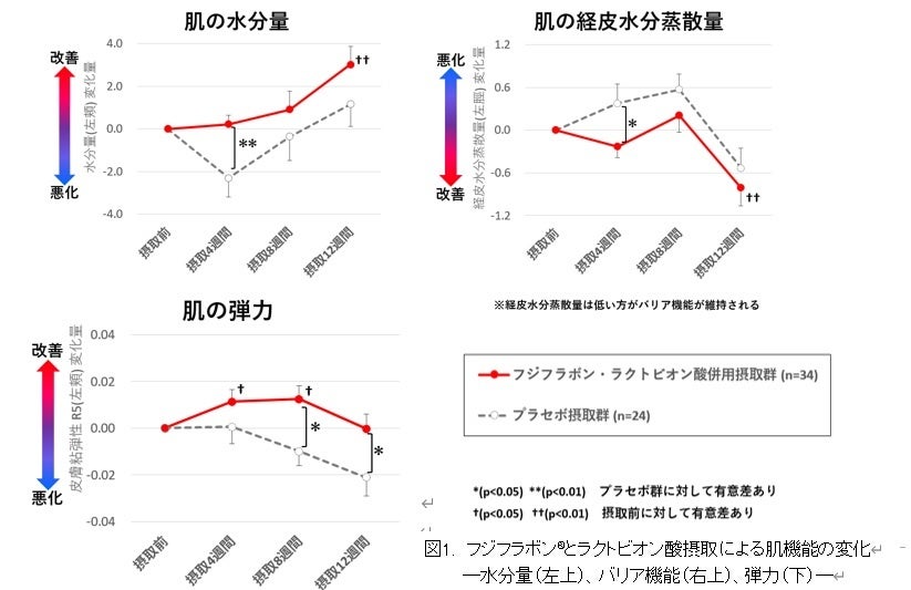 肌の乾燥が気になる女性を対象に、フジッコの大豆イソフラボンの機能性食品素材であるフジフラボン®とラクトビオン酸を同時に摂取するヒト試験を実施したところ、乾燥時期における肌の角層水分量や経皮水分蒸散量(バリア機能)および弾力の維持または改善が確認されました(図1)[4]。