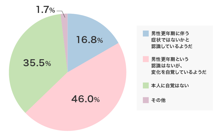 あなたが感じている配偶者やパートナーの「変化」について、そのご本人(配偶者、パートナー)は自分で気がついているでしょうか?との質問についての回答は、変化は自覚しているが、男性更年期との認識がないという答えが、半数近くになり、やはり男性更年期という言葉は、まず男性自身の認識が薄いことがわかります。3人に一人が「変化」があっても「自覚」がないという結果も気になります。