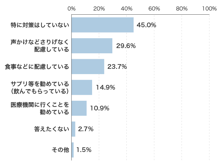 声かけ、食事への配慮、サプリ等の勧めなど、3つの具体策で40代前半が一番の割合に