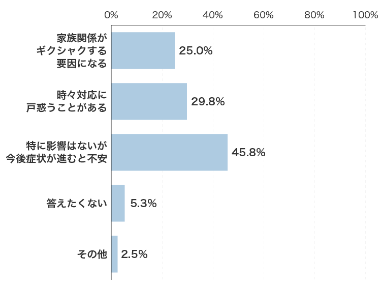 症状が進むと不安‥が半数近く。家族関係のマイナス要因との答えも4人に一人も