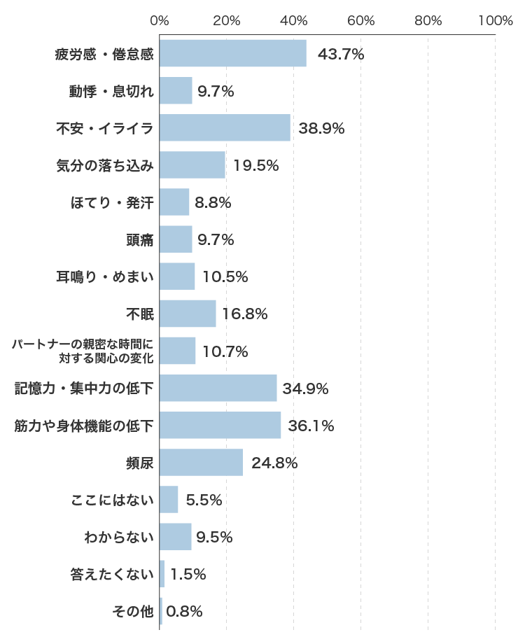 「疲労感・倦怠感」が43.7%と半数近くになり「不安・イライラ」「筋力や身体機能の低下」「記憶力・集中力の低下」がそれぞれ4割近くになりました。