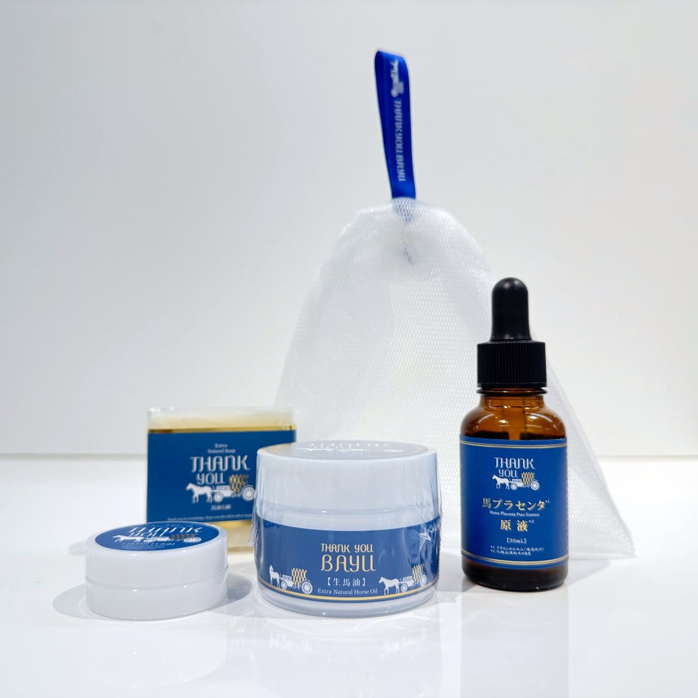 こうね100%生馬油、こうね生馬油石鹸、馬プラセンタ原液、泡立てネット、小分け容器