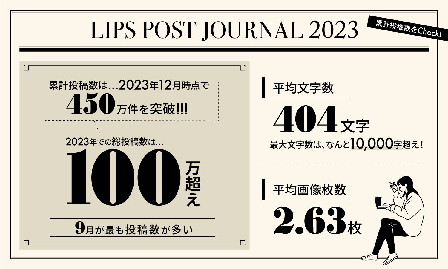 「LIPS」は、2023年8月に累計1,100万ダウンロードを突破し、2023年12月時点で累計投稿数も450万件を突破しました。2023年は、毎月過去平均よりも多くの投稿を集め、中でも9月が最も多くの投稿数を記録。9月はベースメイクの新作、ポイントコスメの新色登場など1年の中でコスメ業界が盛り上がるタイミングともいえる時期。投稿数が最も多いのもうなずけます。