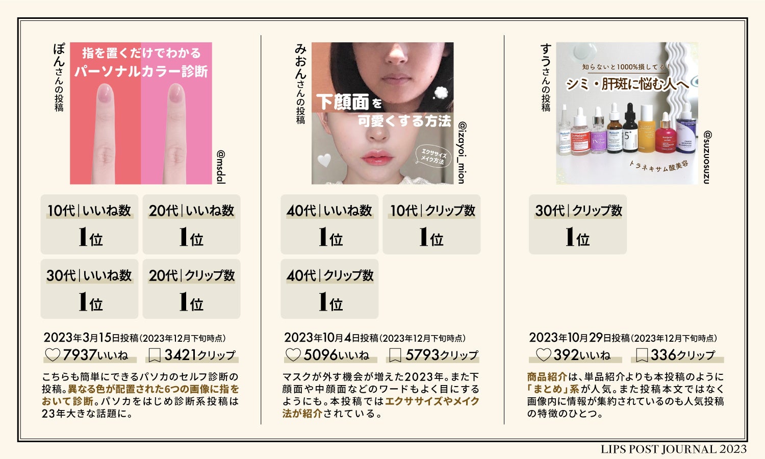 20代では「いいね数」「クリップ数」ともに1位を獲得した投稿です。パーソナルカラーに限らず「骨格診断」や「顔タイプ」など、診断系の投稿も2023年は多く投稿されたように感じます。
