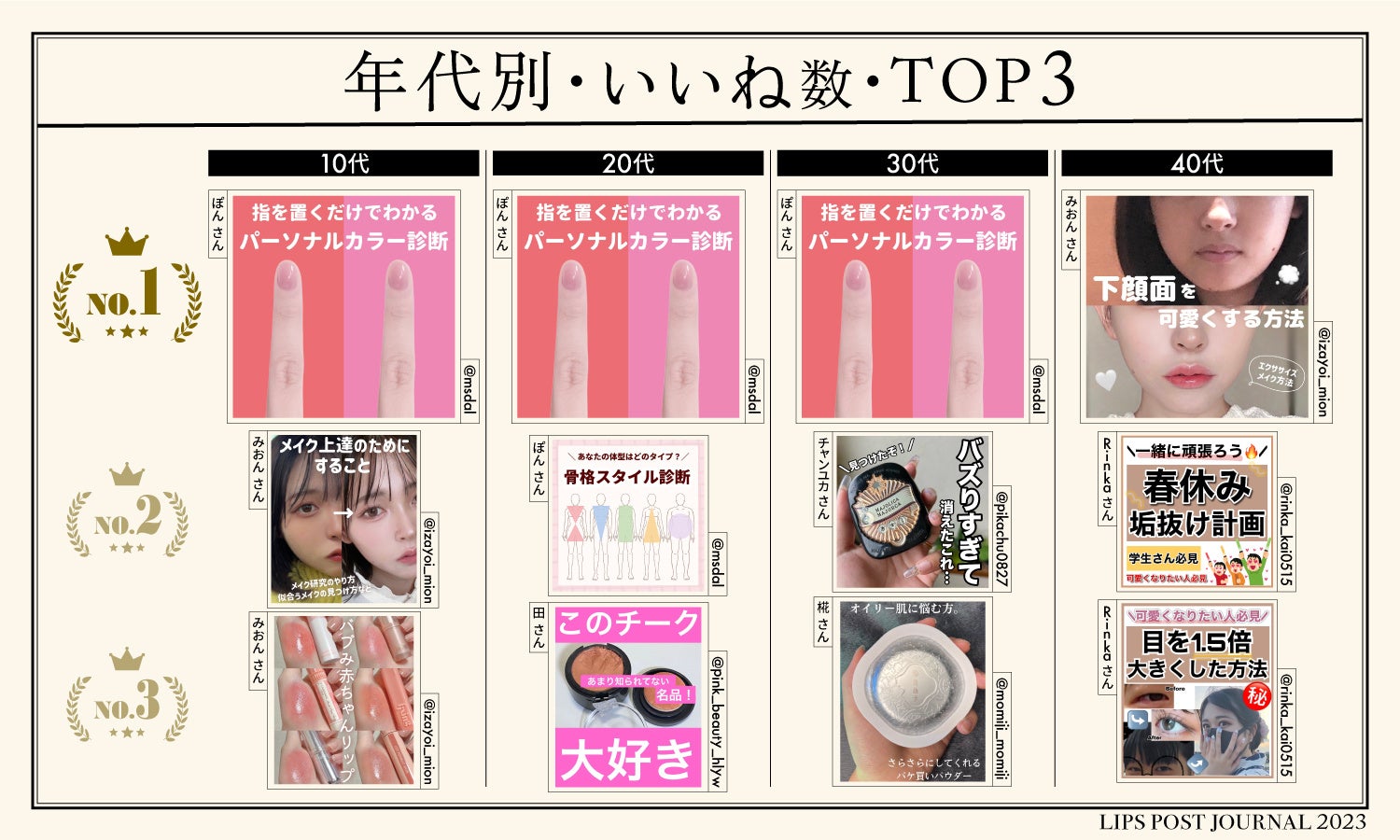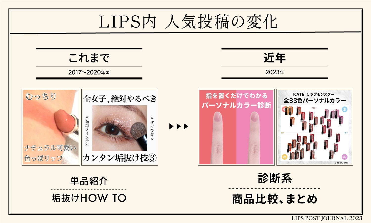 LIPSユーザーの美容事情や、ビューティートレンドをピックアップする『LIPS labo』。今回は、2023年にLIPSに投稿されたクチコミから人気のトピックを分析。年代別に人気の投稿を調査を通じてどういった投稿が人気だったのか・トレンドとの相関などについて分析。さらに過去の人気投稿とも比較し考察しています。