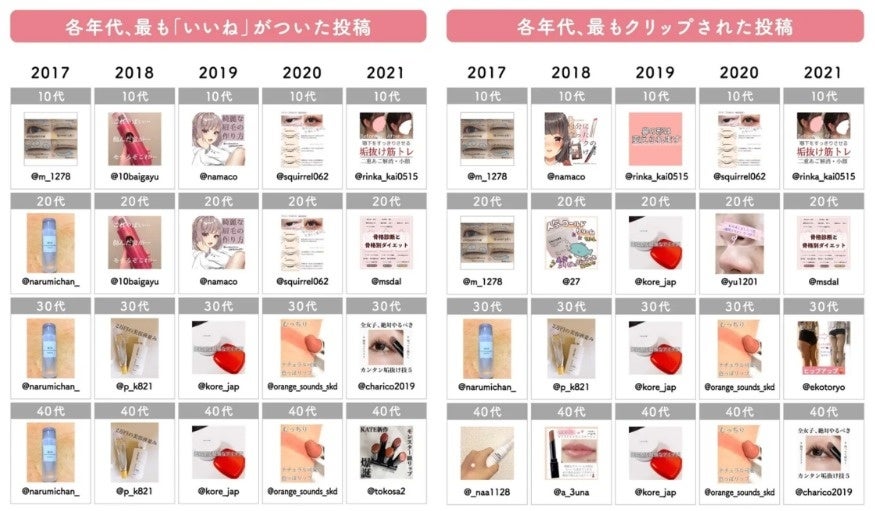 「LIPS labo」では、サービスローンチの2017年から2021年の過去5年の人気投稿を年代別に調査しています。