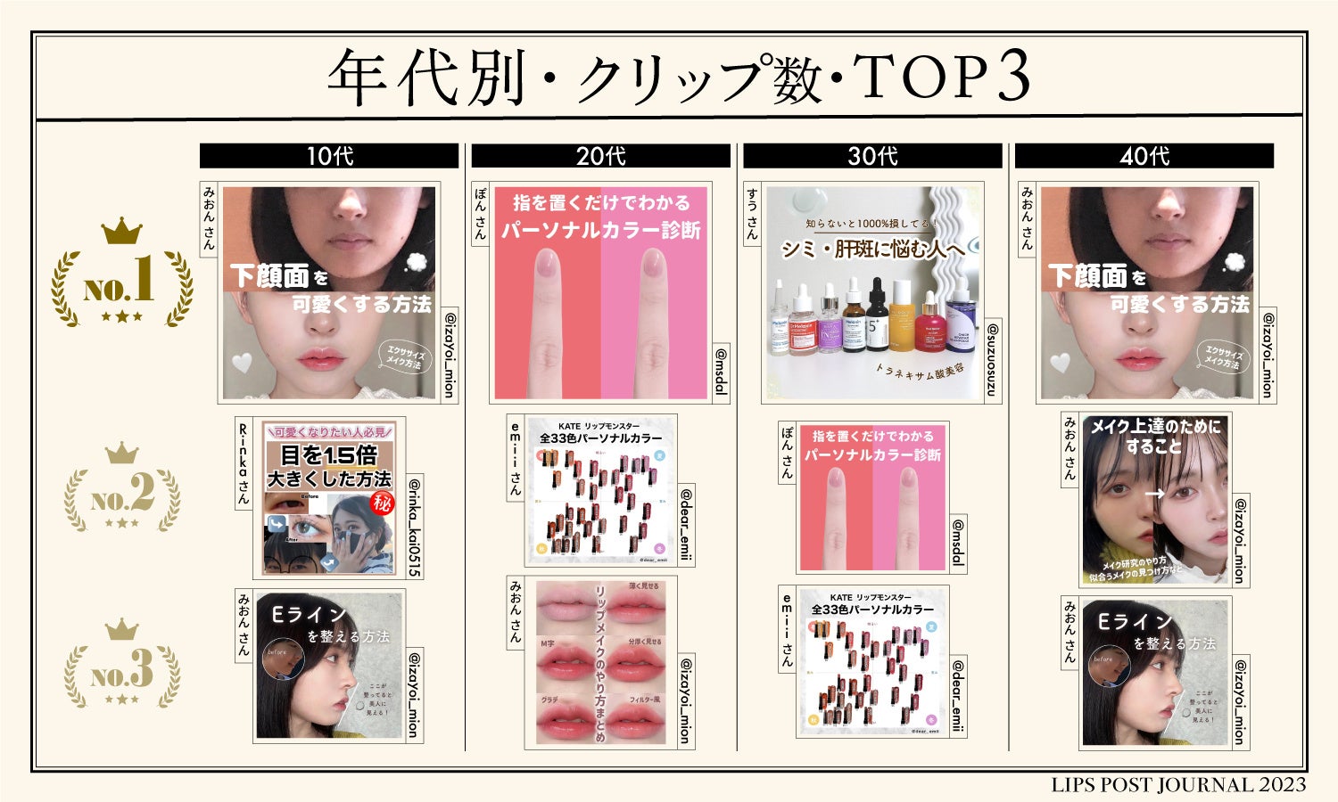 メイクにも慣れてポイントメイクで色を選ぶ楽しさを感じる年代。そして2023年はマスクを外す機会が増えたことや、多くのリップメイクの新作が登場したこともあって、リップメイク関連の投稿が人気を集めたのもうなづけます。