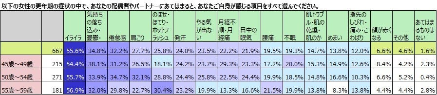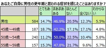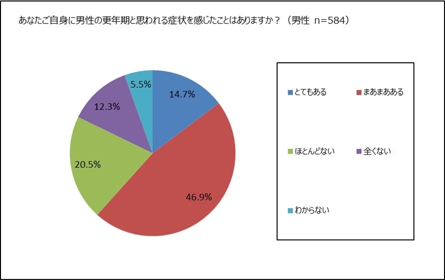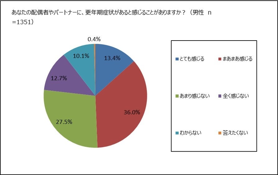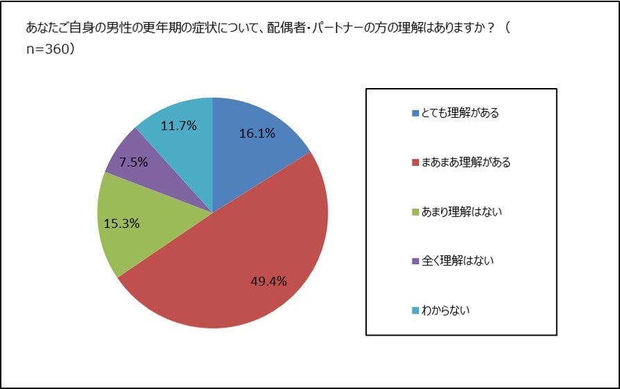 自覚症状を感じているのは、同年代比較では男性の方が多い。男性の更年期症状について、配偶者の6割超が理解がある。