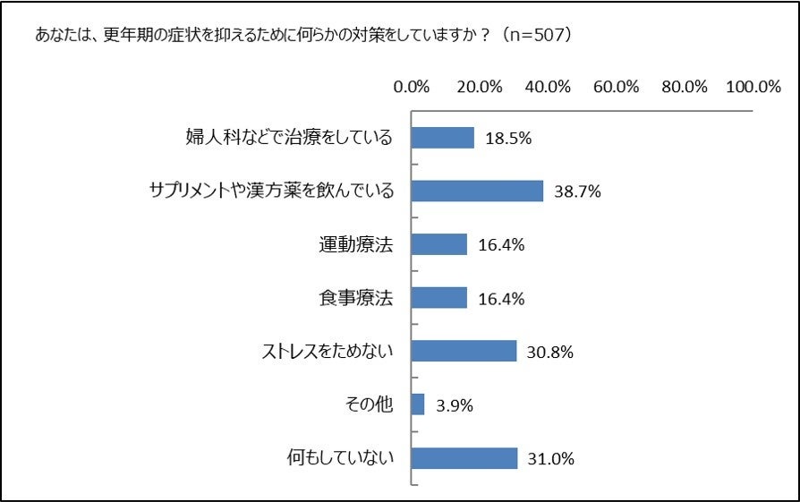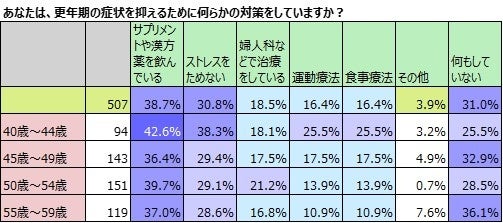 更年期症状でつらいと答えた507名に、症状を抑えるためにどんな対策をしているか聞きました。最も多かったのは、「サプリメントや漢方薬を飲んでいる」で38.7%、続いて「何もしていない」31.0%、「ストレスをためない」30.8%で、「婦人科などで治療をしている」は、18.5%にとどまっています。年齢別に見てみると、40歳~44歳では「サプリメントや漢方薬を飲んでいる」人が最も多く、42.6%と4割を超え、その他の「ストレスをためない」・「運動療法」・「食事療法」を選んでいる人の割合も高いようです。更年期症状が始まり始めた頃の女性は、多くの自分に合う対処方法を探していることが予想できます。