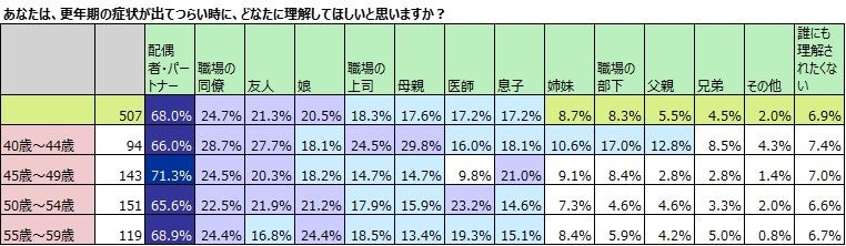 次に、更年期症状があり、つらいと答えた女性507名に、症状が出てつらい時に誰に理解してもらいたいか聞きました。最も理解してほしい相手は「配偶者・パートナー」で、68%と約7割に迫ります。続くのは、「職場の同僚」24.7%、「友人」21.3%でした。一方で「誰にも理解されたくない」と答えた人も6.9%いました。年齢別に見てみると、「配偶者・パートナー」「職場の同僚」などは、年齢による大きな差はありませんが、年齢を重ねるほど「娘」に理解してもらいたい人が増えています。また、「医師」も年齢を重ねるほど、増加傾向がありました。