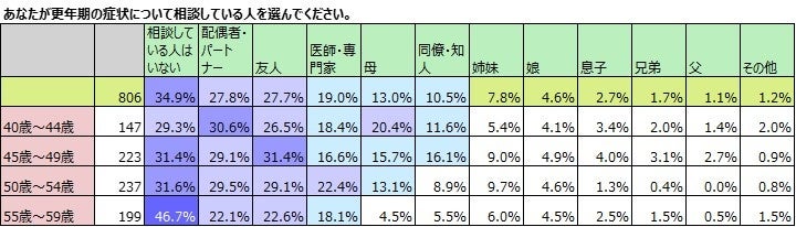 これを年齢別に見てみると年齢を重ねるほど、「相談している人はいない」の割合が増えて行き、55歳~59歳では46.7%と約半数が誰にも相談していないことがわかりました。配偶者・パートナーへの相談も40歳~54歳は約3割ですが、55歳~59歳では22.1%にとどまります。「医師・専門家」への相談が最も多いのは50歳~54歳で、更年期の自覚症状が「とてもある」と答えた世代とリンクします。