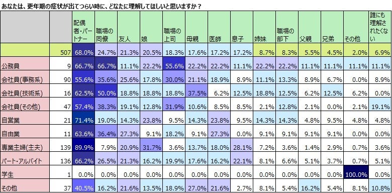また、職業別に理解してほしい人を見てみました。人数が少ない職業は、参考値になりますが、「公務員」や「会社員」は、「職場の同僚」を選ぶ割合が高いようです。すべての職業で、「職場の上司」よりも「職場の同僚」の割合の方が多い傾向があり、想像ではありますが、上司の性別が男性である場合、「更年期の症状がつらい」ことを知られたくないと思っているのではないかとも考えられます。