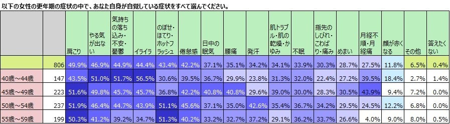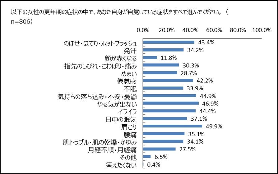 更年期の自覚症状があると答えた女性806名に、具体的な症状を選んでもらいました。多岐にわたる複数の症状を選択する女性が多い結果となりましたが、多かった順で見ると、1位が「肩こり」で49.9%、次いで「やる気が出ない」46.9%、その次が「気持ちの落ち込み・不安・憂鬱」で44.9%でした。ただし、その他にも4割を超える割合で選択されている項目が多く、更年期の症状は複雑に混ざり合って発生するものであるようです。