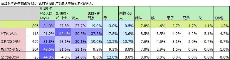 また、症状によって相談している相手が異なるか否かを見てみました。「とてもつらい」と答えた人は、42.4%が配偶者・パートナーに相談し、37.3%が医師・専門家に相談しています。「まあまあつらい」で見ると、1位が「相談している人はいない」で31.8%、続いて「友人」が30.1%、「配偶者・パートナー」は28.1%で、「医師・専門家」に相談している人は、19%にとどまりました。症状の程度によって、相談している相手が変わることがわかりました。