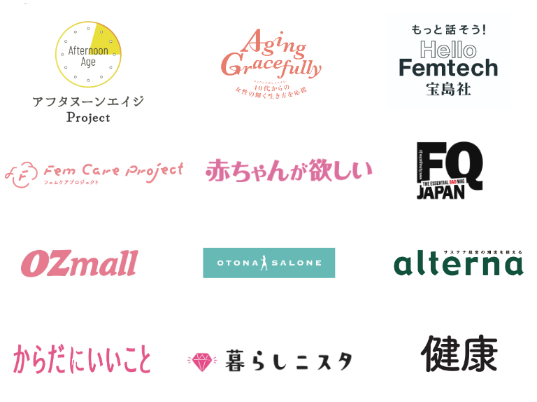 朝日広告社/アサヒグループ食品/アドバンストメディカルケア/アピポルファーマジャパン/アンファー/伊藤園/ウーマンズ/エイチタス/エオストレ/encyclo/オプシス/Olive/かづきれいこ/カノアクルー/クライフ/グリーンハート/広葉樹合板/SAKITUE/サンライフ/SVAKOM INVESTMENT HONG KONG LIMITED/G-Place/シーボン/ジョコネ。/シンバイオシス・ソリューションズ/STI-IR/スポーツモチベーション/セーレン/ダイセル/ダイドードリンコ/タナック/つばめLabo/TL Genomics/ニチバン/美工/BeLiebe/ピルボックスジャパン/Femtech cosme tokyo/フジスコ/pluskampo/プラスコンフォート/ボディスプラウト/松吉医科器械/メニコン/menopeer/メリードゥ ビューティ プロダクツ/ユタックス/ricca/リリイーグル/RecoD/ロート製薬/WaiSE (政策研究大学院大学)