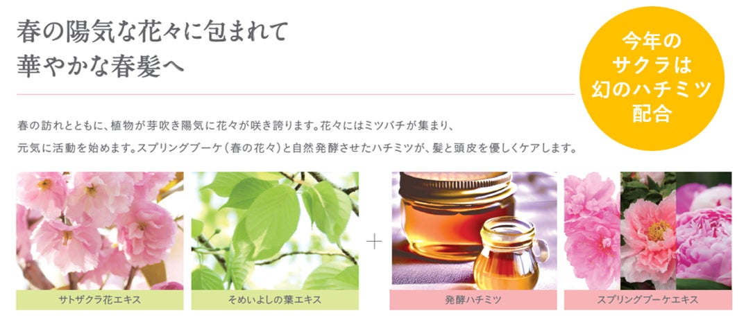 スプリングブーケ(春の花々)と発酵ハチミツ+ふたつの「桜エキス」が髪と頭皮を優しくケアします。