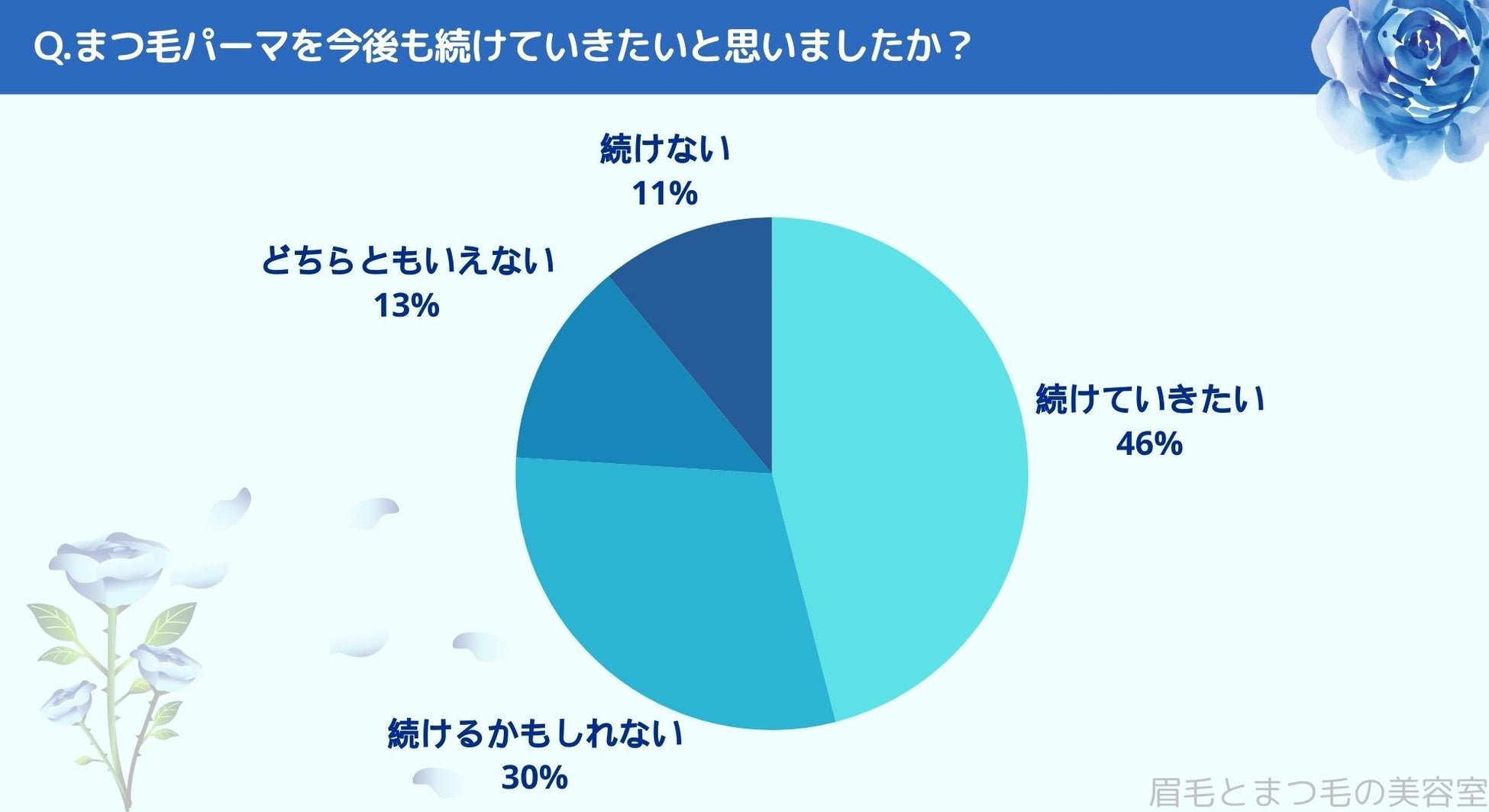 まつ毛パーマを今後も続けたいかお聞きしたところ「続けていきたい(46%)」、「続けるかもしれない(30%)」、「どちらともいえない(13%)」、「続けない(11%)」という結果になりました。