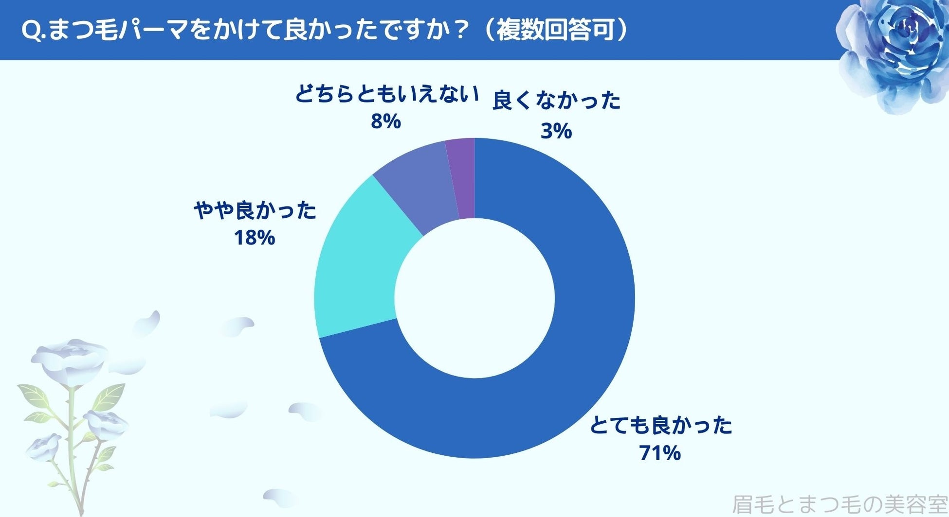 まつ毛パーマをかけて良かったかお聞きしたところ「とても良かった(71%)」、「やや良かった(18%)」、「どちらともいえない(8%)」、「良くなかった(3%)」という結果になりました。