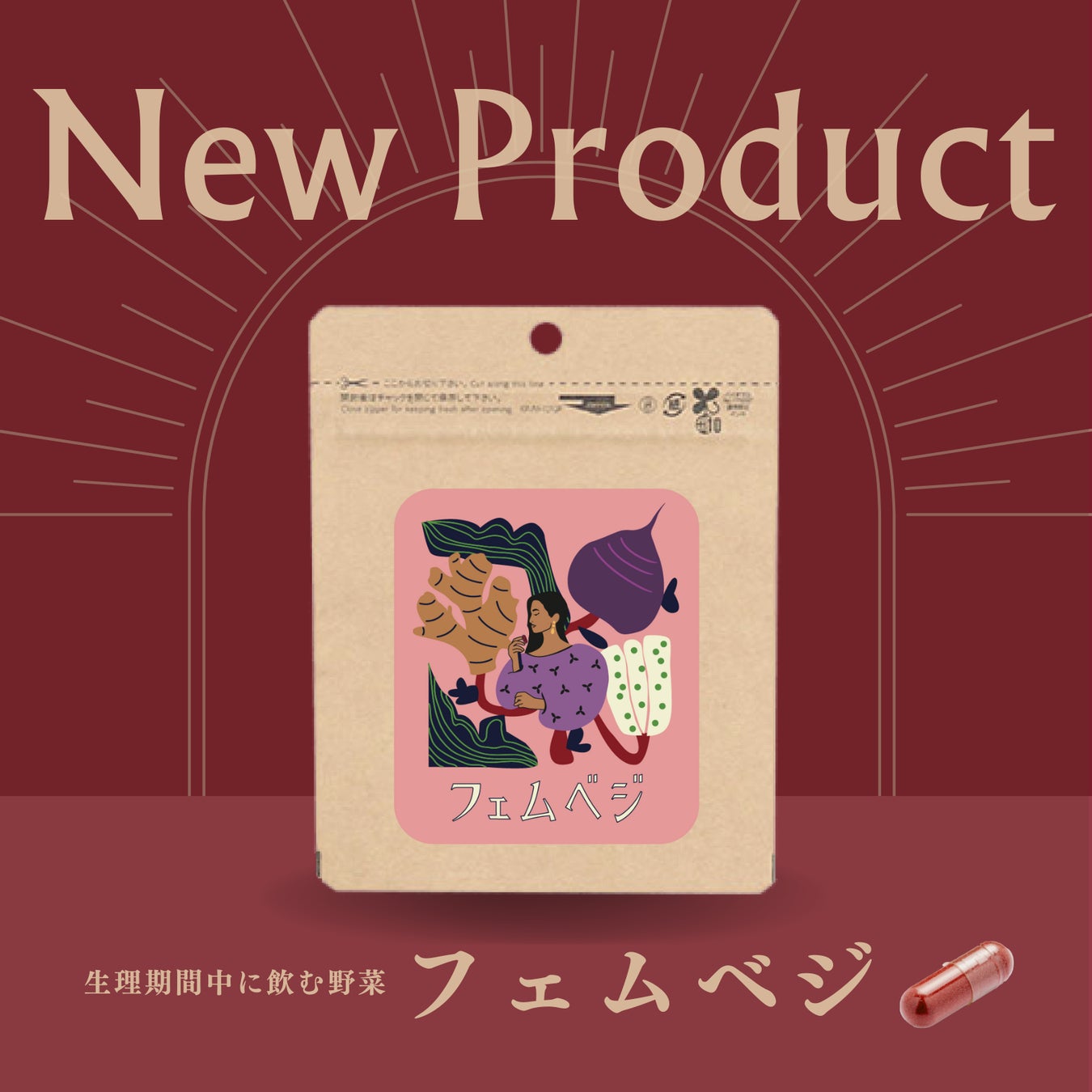 今回販売する『フェムベジ』は、ジュースやサプリとは違い、野菜を丸ごと粉にした完全無添加の野菜パウダーで、「オールフィト濃縮乾燥法*」という特許技術と管理栄養士の監修により開発され、農薬不使用の生姜とビーツだけを使用し、安全に野菜の豊富な栄養をとることが可能な商品です。多くの女性が心身の変化を感じる月経中の1週間をサポートすることを目指しています。