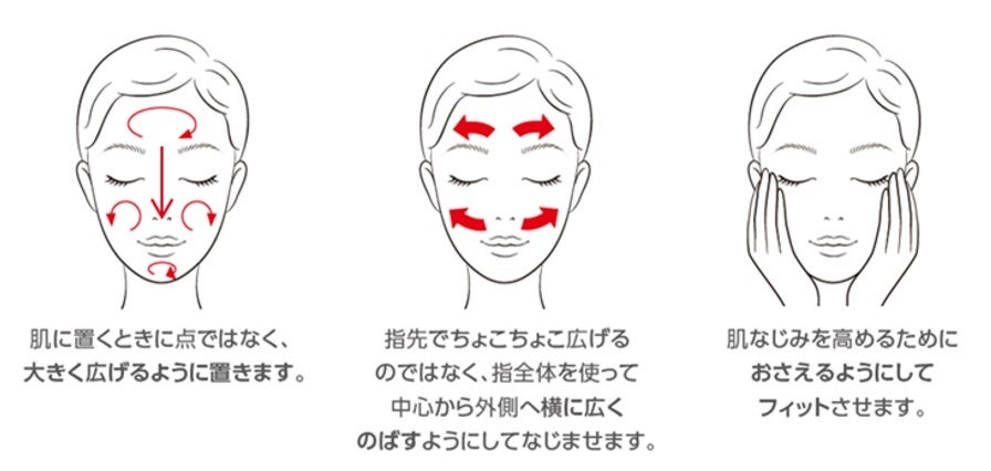 ●指全体を使って、中心から外側へのばすようにしてなじませ、フィットさせます。
