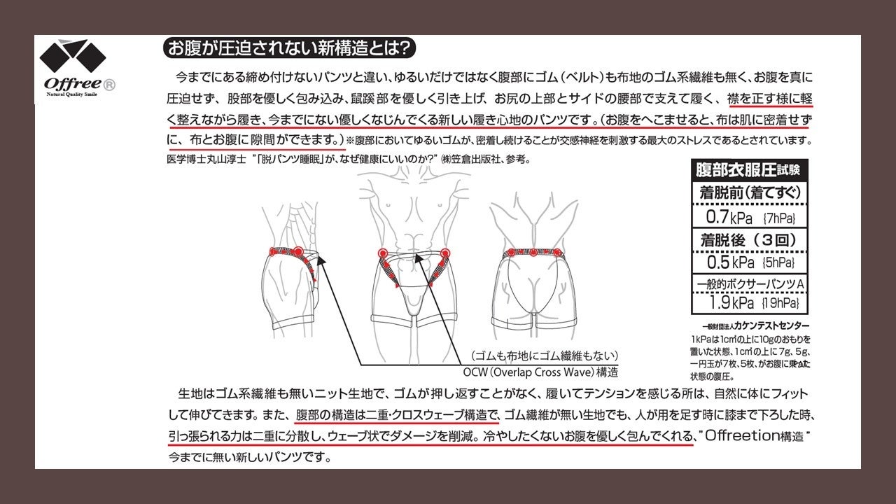 また、従来のゴムやベルトがなく、お腹を圧迫することなく履けるため、未体験の着用感をもたらします。お腹をへこませると、パンツが肌に密着するのではなく、お腹との間に隙間ができ、くっついたり離れたりして指圧の役目になるのも特徴です。呼吸によってお腹は膨らんだりへこんだりしますが、従来のパンツでは緩いゴムも同時に伸縮し続けます。ゴムは体から決して離れず、緩みつつもお腹を締め続けています。実は、この緩いゴムこそが、交感神経を刺激する元凶だったのです。この問題に着目しこの新製品を開発しました。パンツの圧力に悩んでいる方々にとって、この革命的な製品は間違いなく解決策となることでしょう。(ゴムの圧力から解放され、ホッとする状態が続きます。)