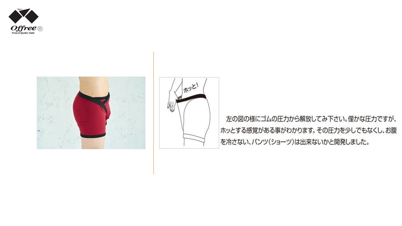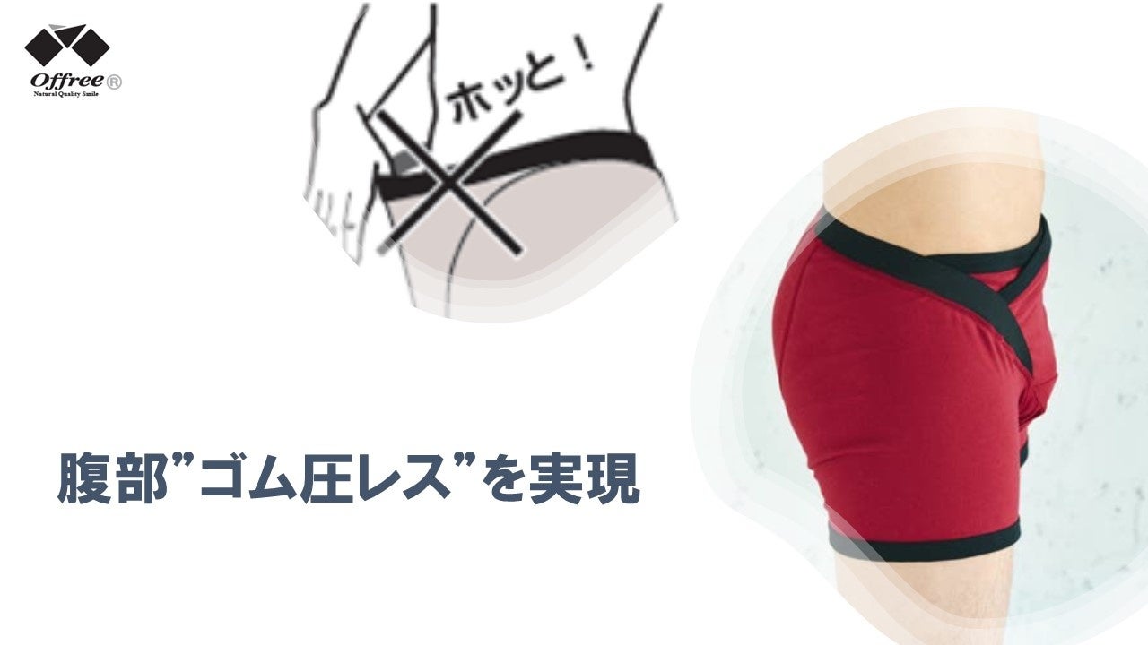 Offree/オフリーは、お腹のゴム圧が極限までゼロに近づけ「特許」を取得した新構造です。腰回りのゴムによる圧迫をなくし、股部を柔らかく包み込み、鼠蹊部を優しく引き上げ、お尻の上部とサイドの腰部でサポートするように設計された、未体験の優しく包み込む新感覚のパンツです。パンツのデザインに革新的なアプローチを取り入れ、お腹にかかる余分な圧力を解放することに特化しています。この革新的なデザインにより、ゆるさだけでなく、お腹を締めつけないことを重視し、股部を優しく包み込み、鼠蹊部を引き上げ、お尻の上部と腰部でしっかりサポートします。また、履く際に襟を整えるように履き、独自の快適さを提供します。