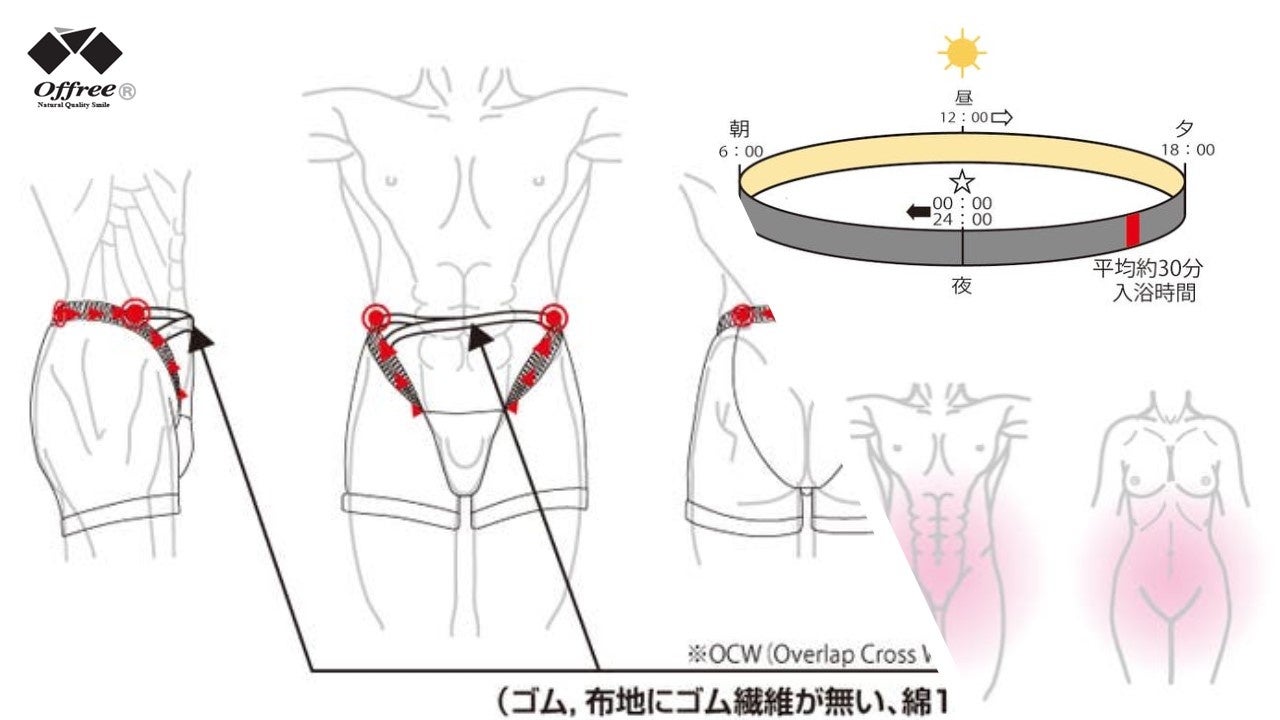 日本人のお風呂の平均入浴時間である約30分以外は、多くの方は常にパンツを履いている生活ではないでしょうか?今回、この圧迫された現実に目を向け、お風呂から上がった後も快適さと自由を楽しむためにOffree/オフリーを開発しました。いままで世の中になかったお腹や体に優しくフィットしながら、同時に快適さを追求した革新的なデザインを実現。お腹を締め付けから解放されるウェアです。これによりお風呂から出てからも、Offの大切な時間をFree(自由な)に過ごすことが可能となり、新しいライフスタイルをご提案いたします。