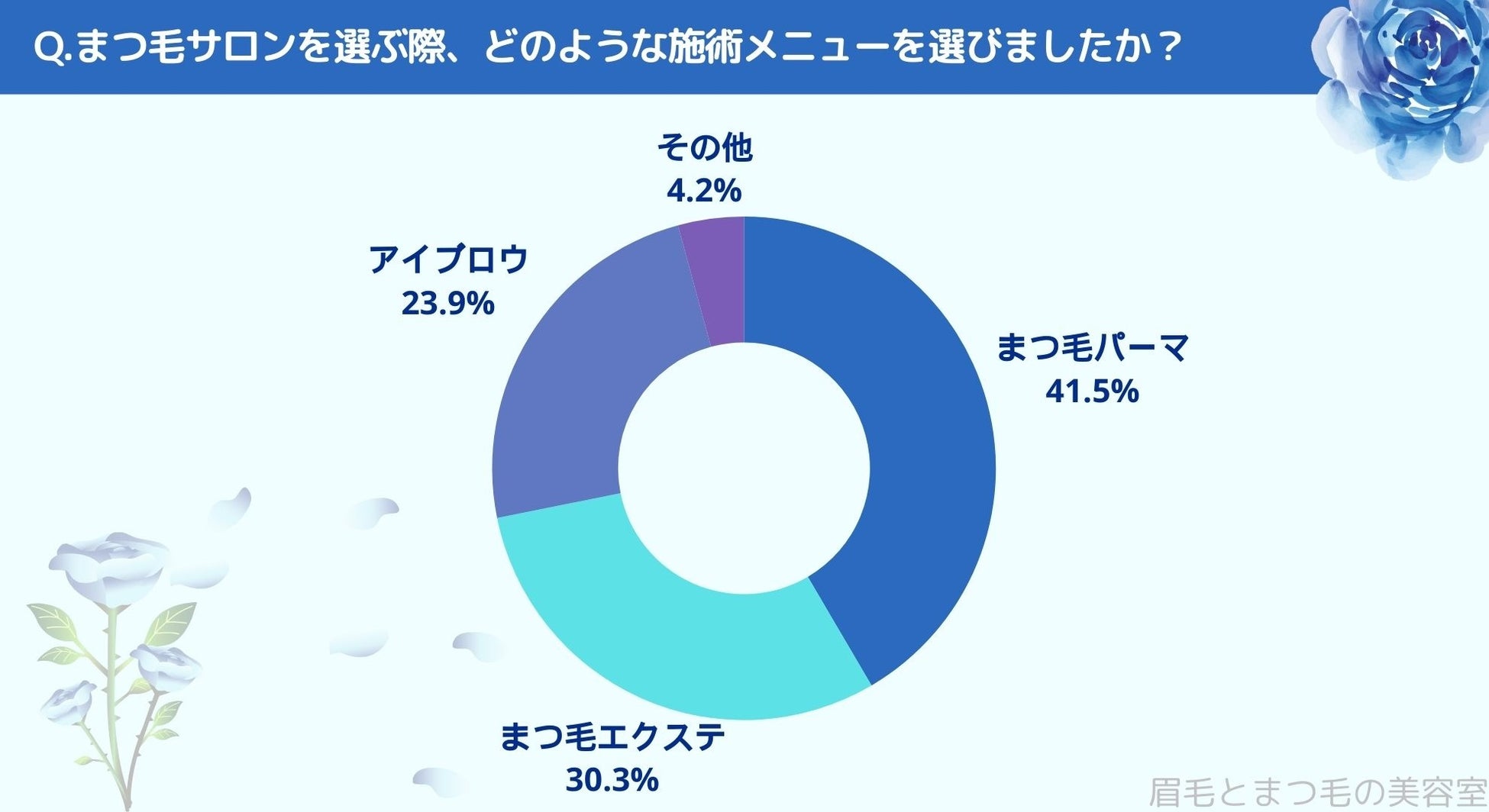 まつ毛サロンを選ぶ際に、どのようなメニューを選んだかお聞きしたところ「まつ毛パーマ(41.5%)」、「まつ毛エクステ(30.3%)」、「アイブロウ(23.9%)」、「その他(4.2%)」という結果になりました。