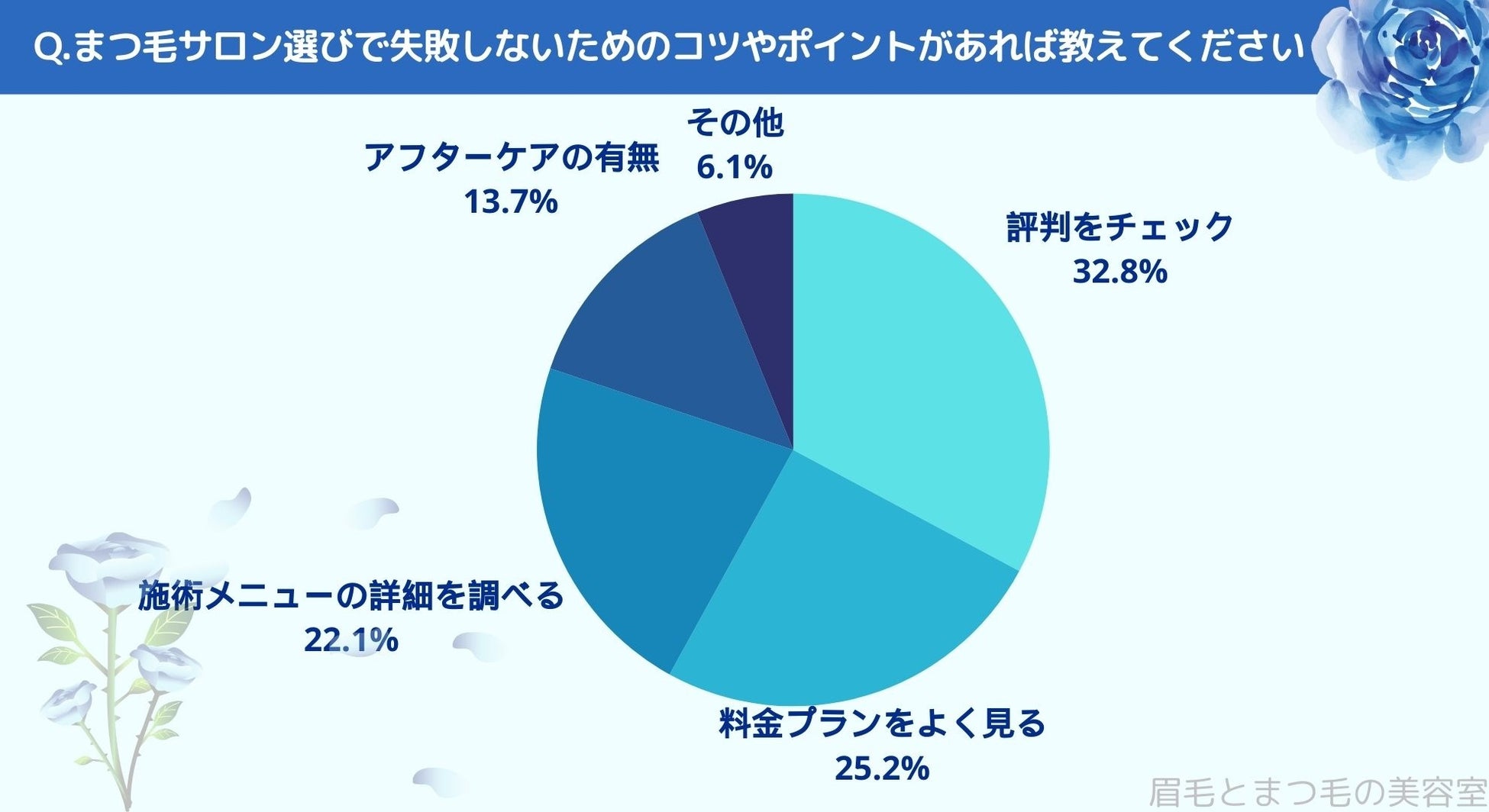 まつ毛サロン選びで失敗しないコツをお聞きしたところ「評判をチェック(32.8%)」、「料金プランをよく見る(25.2%)」、「施術メニューの詳細を調べる(22.1%)」、「アフターケアの有無(13.7%)」、「その他(6.1%)」という結果になりました。