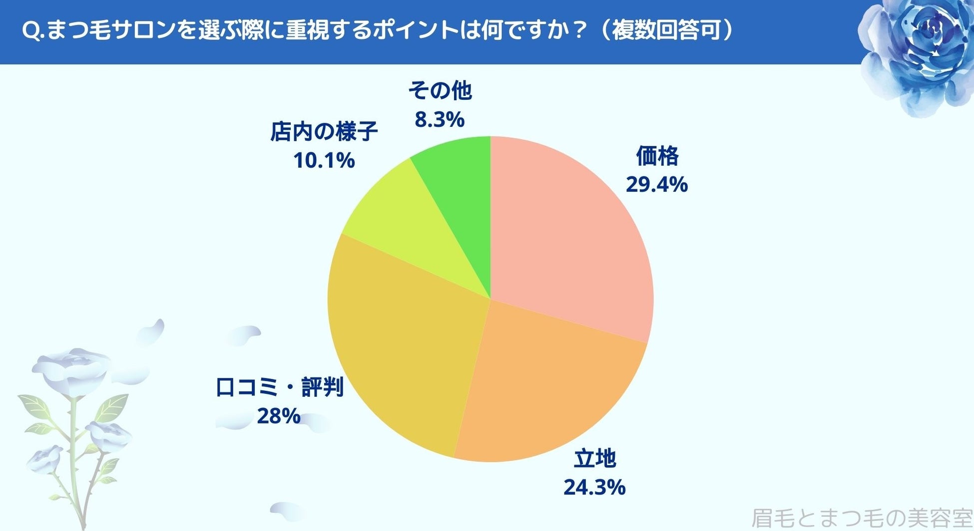 まつ毛サロンを選ぶ際に重視していることをお聞きしたところ「価格(29.4%)」、「立地(24.3%)」、「口コミ・評判(28%)」、「店内の様子(10.1%)」、「その他(8.3%)」という結果になりました。
