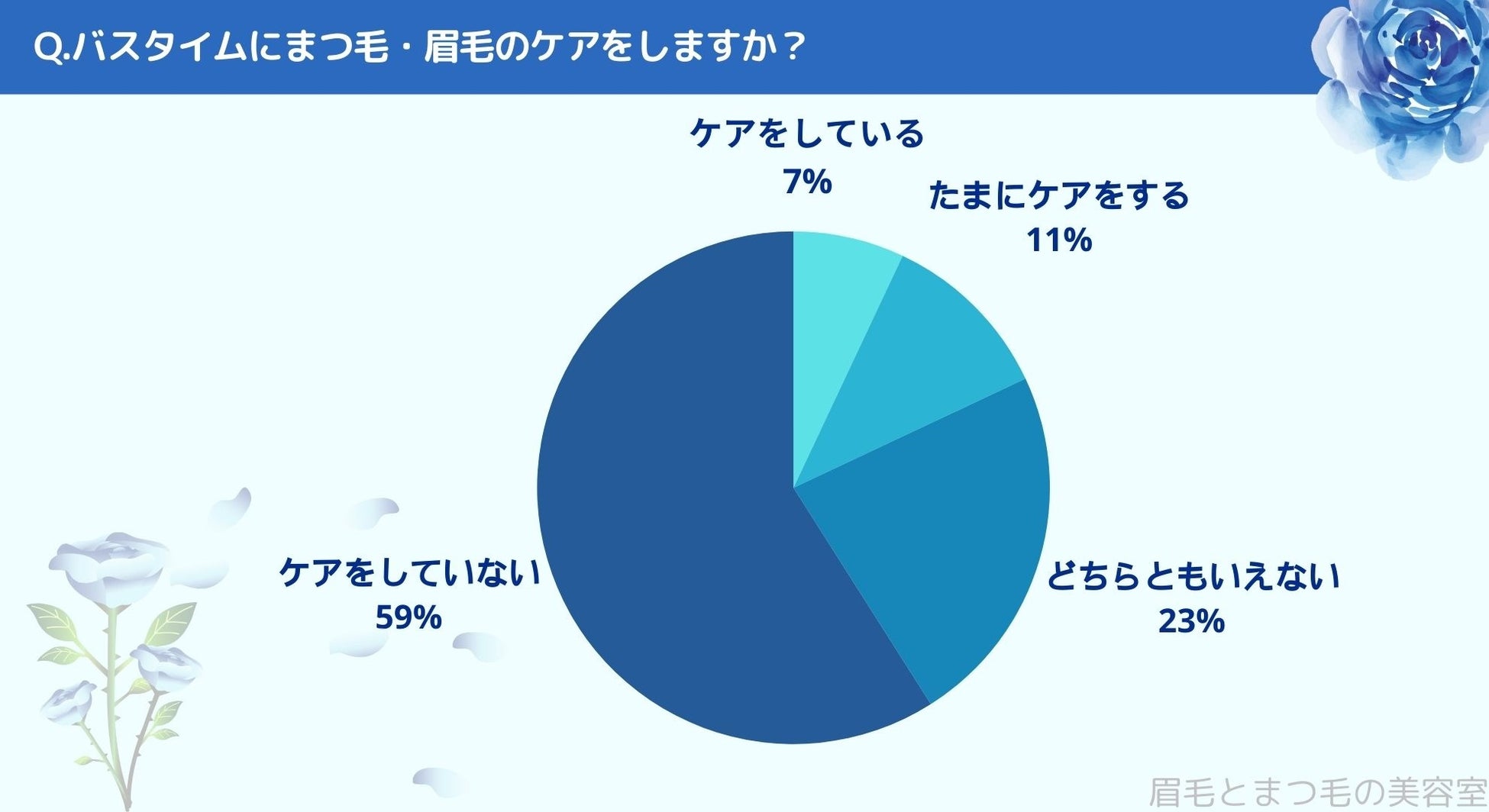 バスタイムに眉毛orまつ毛のケアをしているかお聞きしたところ「ケアをしている(7%)」、「たまにケアをする(11%)」、「どちらともいえない(23%)」、「ケアをしていない(59%)」という結果になりました。