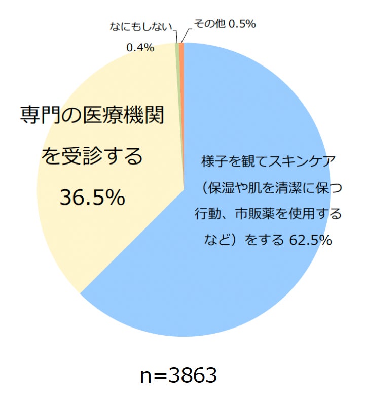 ・湿疹が出た後、様子を観る保護者が多く、専門医療機関を受診する割合は36.5%に留まったため、まずは経過観察をしている保護者が多いと考えられます。