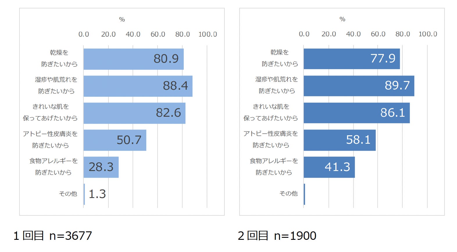 保湿の目的をアトピー性皮膚炎や食物アレルギーを防ぐ目的とする割合が2回目で増加した