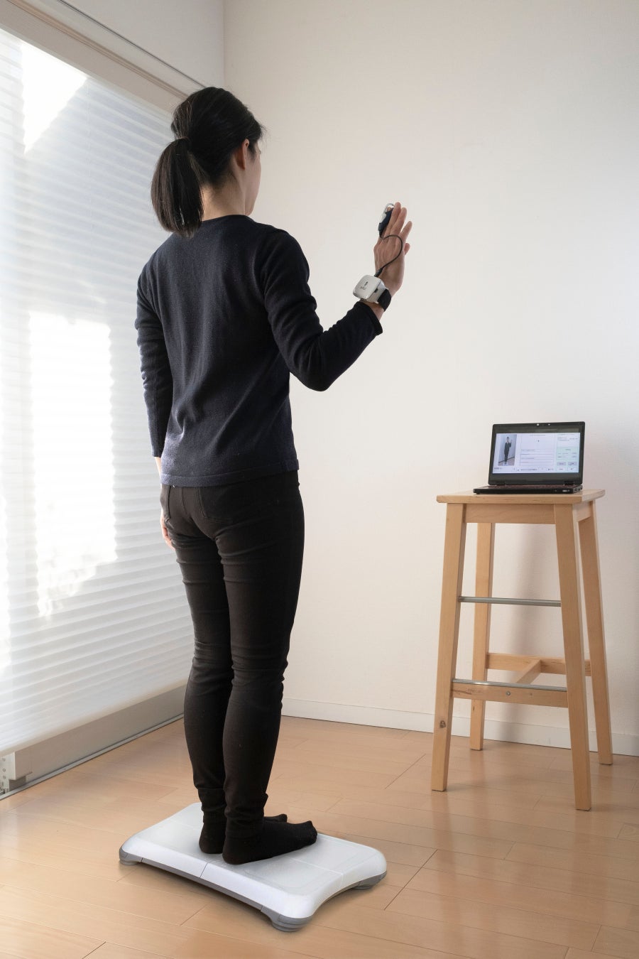 立位年齢®検査装置StA²BLE は、指先への感覚刺激とAI 技術により世界で初めて転倒リスクの可視化を実現したウェアラブルデバイスです。指先に取り付けた機器で振動を与え、姿勢が安定している状態から、急に振動をなくし、そこから生じた体のふらつき具合を重心動揺計で計測します。測定結果から、感覚機能と身体機能を評価し、総合的な評価となる立位年齢を評価します。本方法は、省スペースで、わずか1分間で測定が可能であり、身体的な負担が少ない評価法です。併せて、転倒予防のため、機能改善訓練の提案を行うことができます。労働現場や、デイサービス、病院、老人福祉施設など様々なシーンに転倒リスクの見える化サービスを提供し、転びにくい身体つくりのための提案をしています。