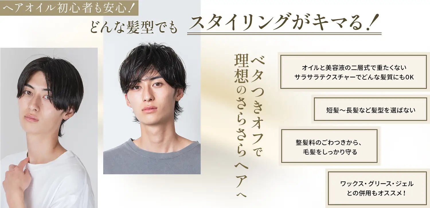 ショート、ロング、パーマヘアなど どんな髪型でもスタイリングがキマる。(ワックス、グリース、ジェルとの併用もオススメ)ベタつきオフのさらさらテクスチャーで理想のヘアスタイルへと導きます。