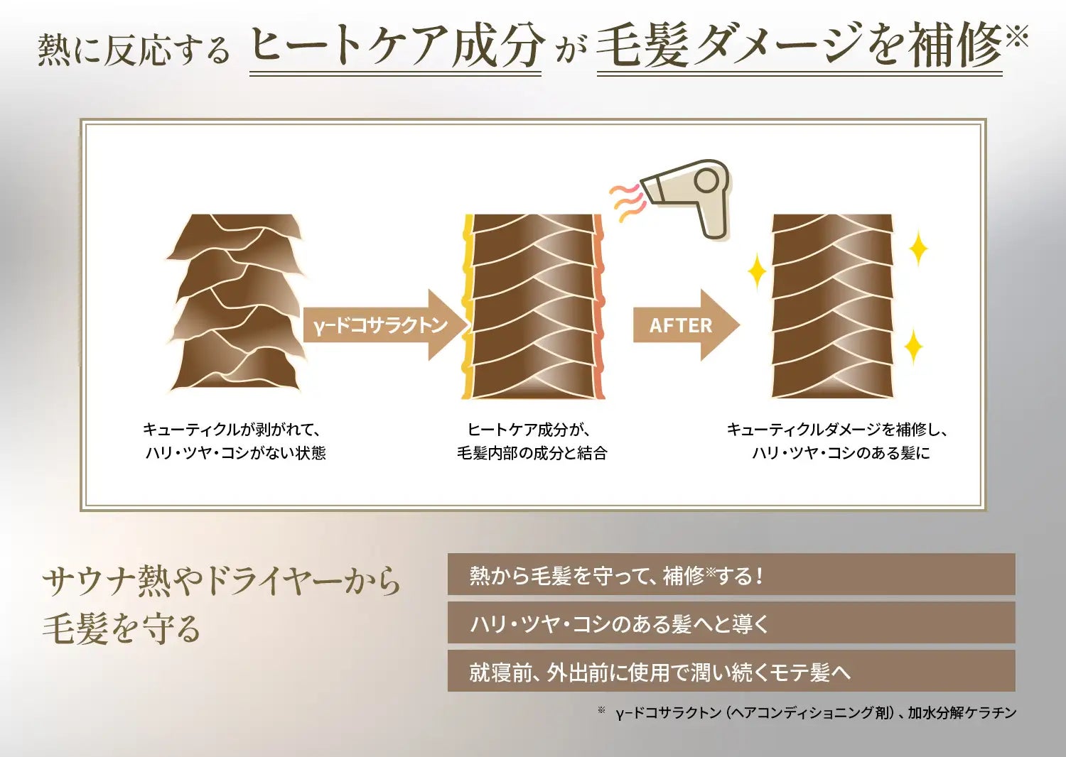 熱に反応するヒートケア成分が毛髪ダメージを補修。サウナ熱やドライヤーから毛髪を守る。ハリ・ツヤ・コシのある髪へと導く。
