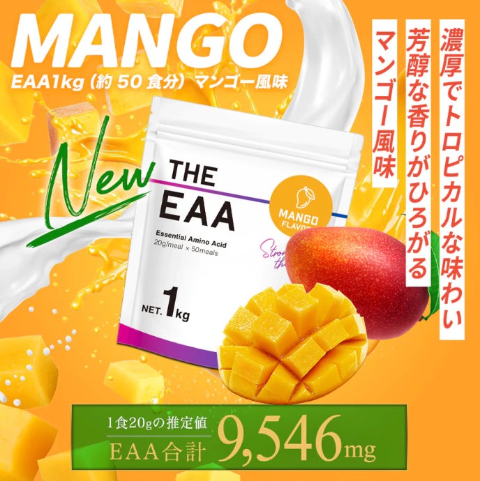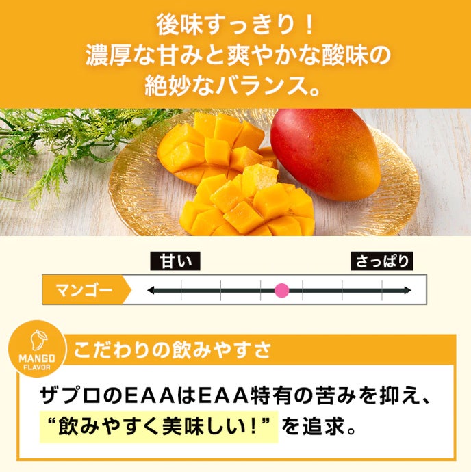 今回発売したTHE EAAのマンゴー風味は、ザプロユーザーからの「他のフレーバーも飲んでみたい!」という声を商品化いたしました。THE PROTEIN(通称:ザプロ)公式X(旧Twitter)でアンケートを実施すると、1位:マンゴー、2位:ラフランス、3位:キウイ、4位:グレープフルーツになり、マンゴーが1番人気の結果となりました。トロピカルでジューシーな完熟マンゴーの風味を再現するために、何種類ものマンゴー香料を試作して香料を選定するなど何度も試作を重ねました。その結果、商品開発メンバーが満場一致で「美味しい!」と思えるフレーバーに仕上がりました。今後もザプロユーザーからの声を大切に商品を開発して参ります。