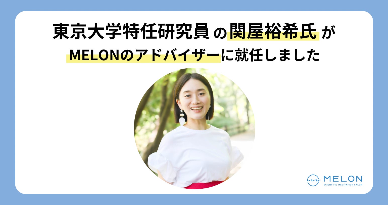 科学的エビデンスに基づいたマインドフルネス・プログラムを提供する株式会社Melon(本社:東京都港区、代表取締役CEO:橋本 大佑、以下MELON)は、東京大学大学院医学系研究科 デジタルメンタルヘルス講座 特任研究員の関屋裕希(せきやゆき)氏をアドバイザーとして迎えたことを発表いたします。