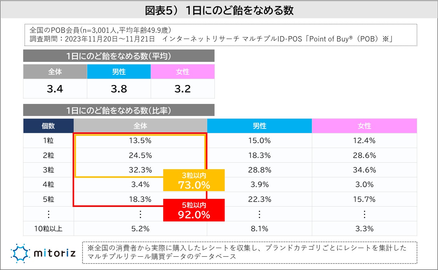 ・1日にのど飴をなめる数の平均は「3.4粒」で、男女では男性の方が多くなめている